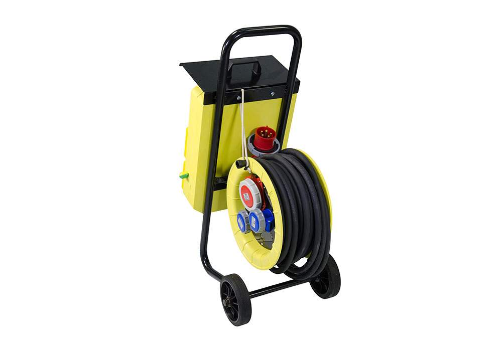 Electric Panel for construction job sites, with stand and wheels, cable winder and 25 m. extension tube 5G6 with plug of 32A 5P 400V.
