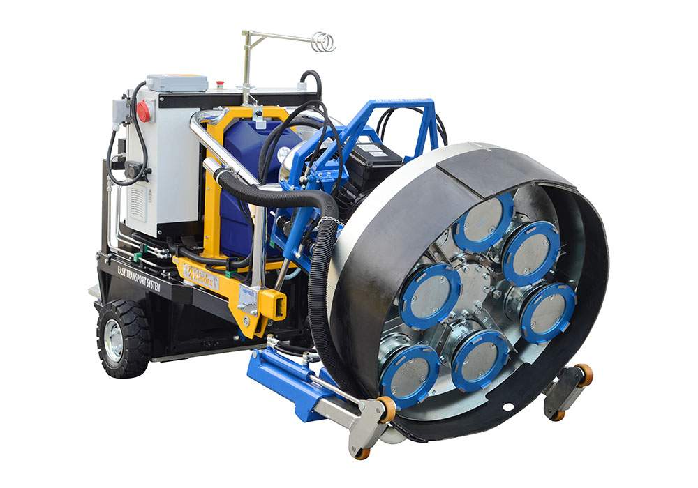 Die größte kontrarotierende 6 Kopf-Schleifmaschine mit Fernsteuerung, verstellbarem Anpressdruck und variabeler Drehzahlsteuerung.